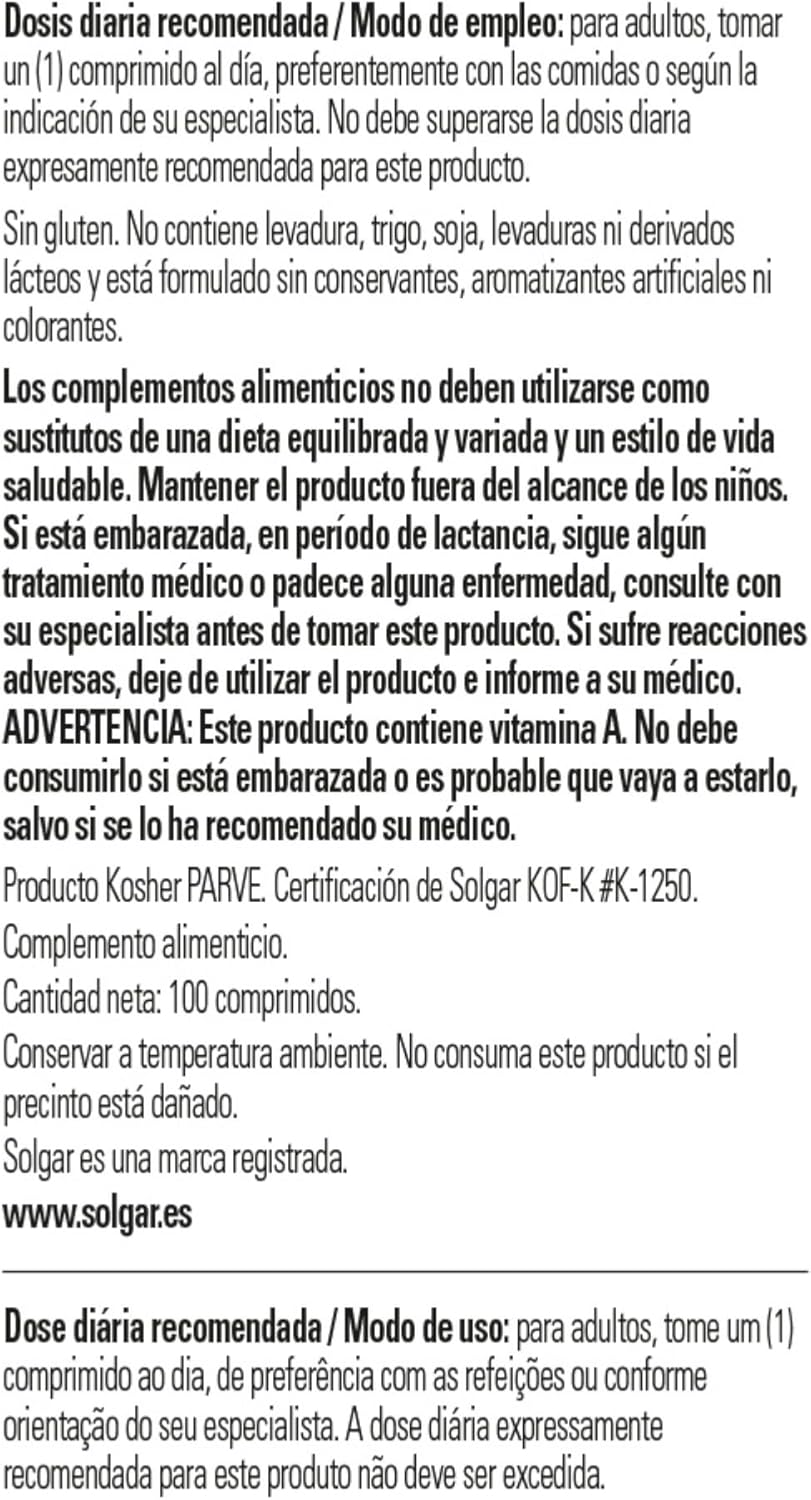 Solgar es una marca de confianza y sus productos asà lo corroboran. Buena para la vista, para las membranas internas, las alergias alimentarias.Dificultad máxima de supplementacion, una sobredosis causa dolor de cabeza y nauseas.Mejor lee mucho antes de empezar a tomarla
