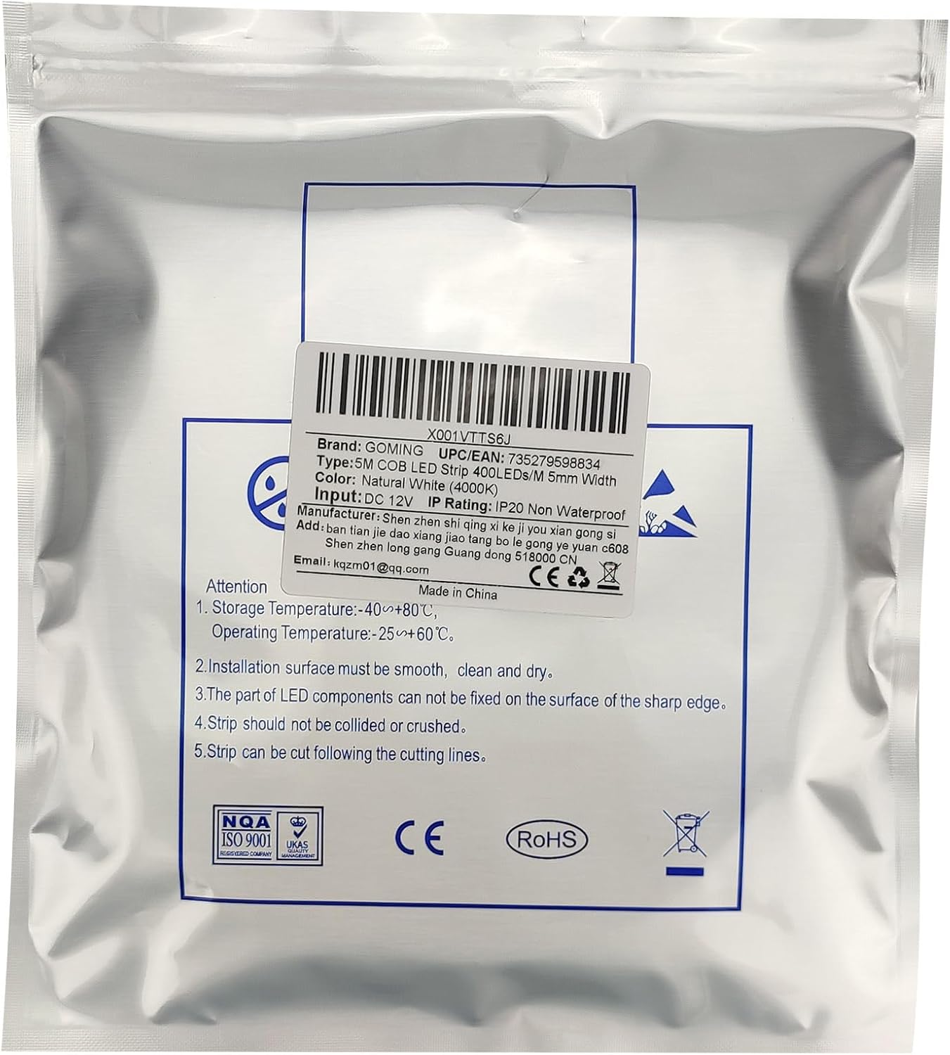 6 reviews for 12V 5mm Width COB LED Strip Light Natural White 4000K 16.4ft(5M) 2000LEDs CRI 93+ Uniform Glow Flexible IP20 Not Waterproof LED Tape Lights for DIY Bedroom Kitchen Home Decor(No Power Supply)
