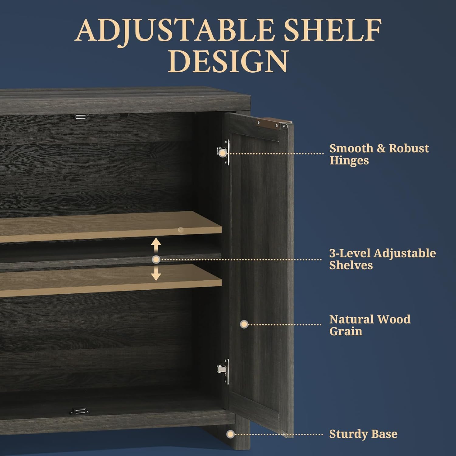 3-Level Adjustable Shelves: The kitchen cabinet includes adjustable shelves with 3 height options, each differing by 2.51 inch. Customize the space for your needs, whether it’s for books, tools, or decor, ensuring efficient storage and adaptability