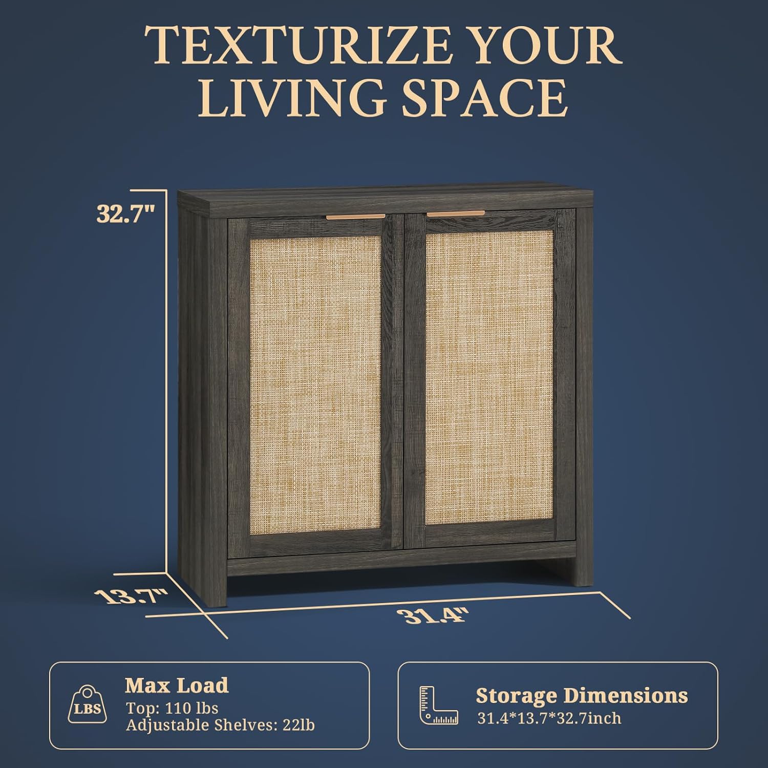 Rattan Cabinet Dimensions: Overall size: 126L x 13.78W x 32.72H inches | Storage: 28.58L x 13.77W x 26.59H inches | Top panel capacity: 110 lbs | Adjustable shelves capacity: 22 lbs | Bottom shelf capacity: 33 lbs | Feet Height: 2.36H inches